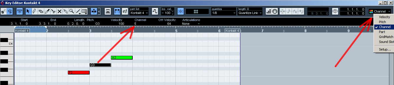 Подскажите, как в Cubase управлять инструментами в Kontakt'е при помощи каналов (разные цвета нот)? В FL Studio просто назначаешь на параметр "Midi Ch." инструмента (в Kontakt'е) какой-то канал, потом красишь ноту в этот цвет - и эта нота проигрывает звук тем же инструментом, на канал которого она назначена. В Cubase почему-то так просто это работать не хочет.