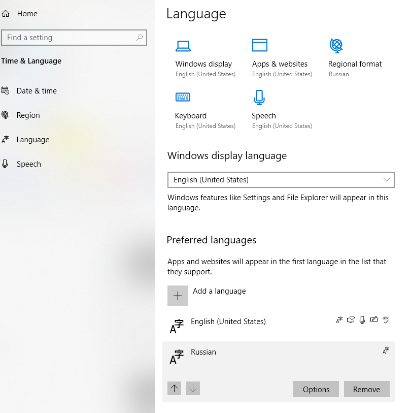 5. Далее открываем в Windows Time & Language (Свойства Времени и Языка - не знаю как на русском будет) переходим на вкладку Language (настройки языка):