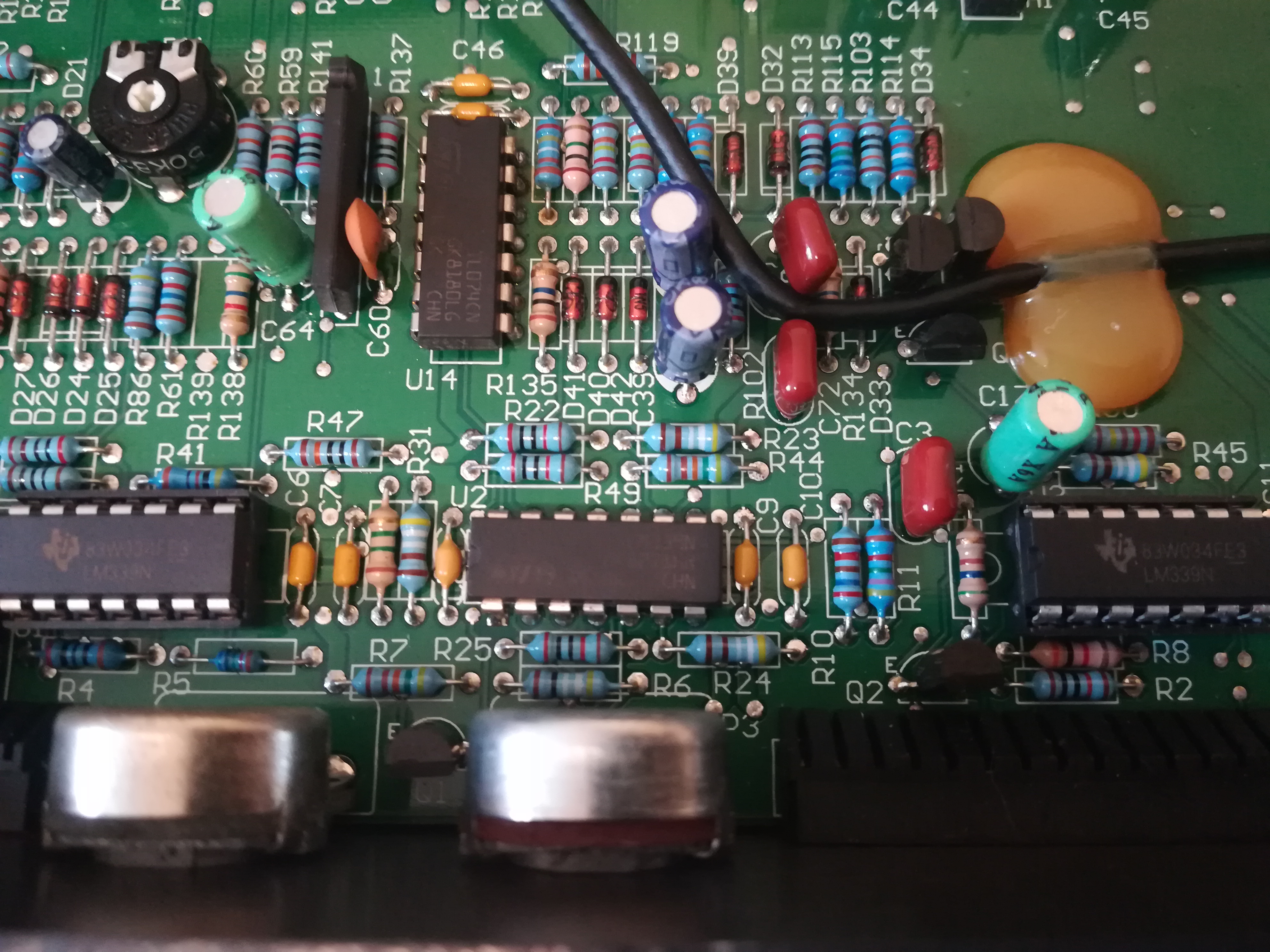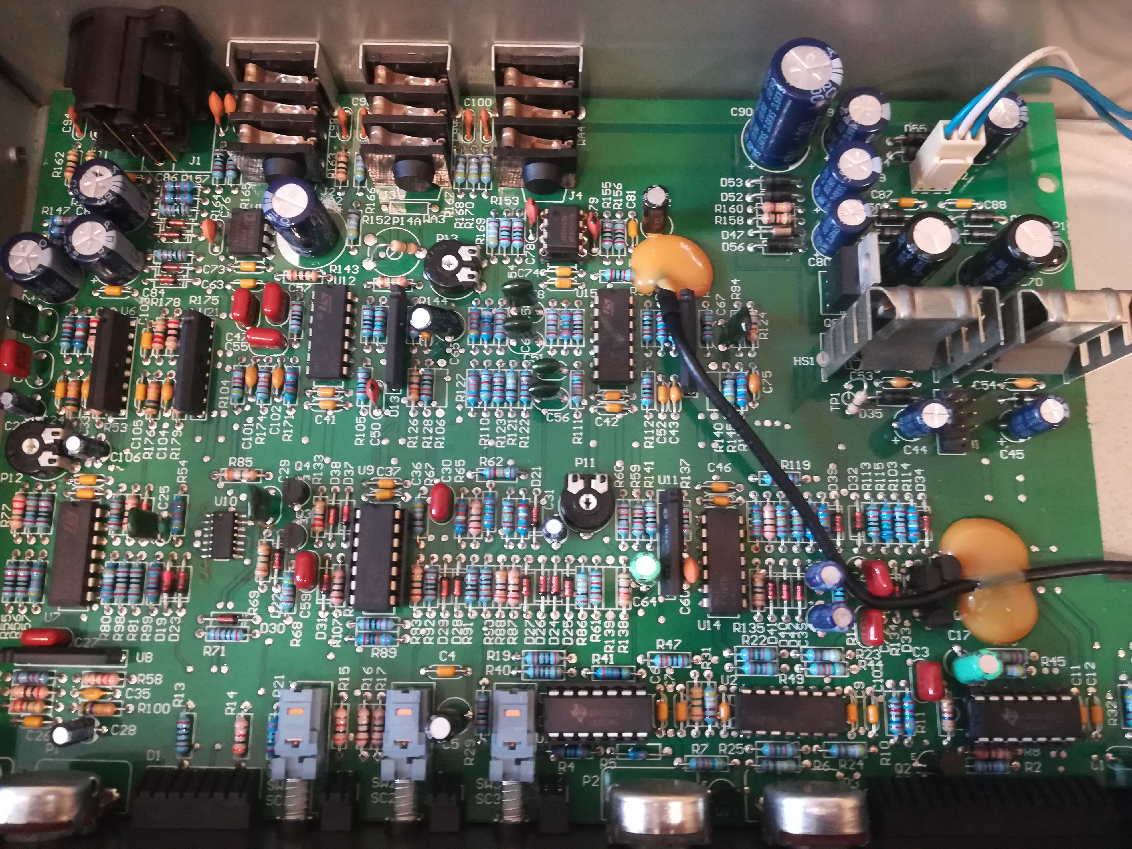 Проблема собственно описана в заголовке, из подробностей: постоянно горят все светодиоды секции компрессора вне зависимости от настроек/подключенного микрофона и тп (хотя эффект от изменения положения регуляторов есть) и при активации среза ничего не происходит (в тч светодиод не горит), кто-нибудь, помогите, пожалуйста разобраться, куда нужно копать и можно ли это починить без сдачи в ремонт ? Есть схема на прибор (прикрепляю) паяльник держать в руках умею, но на уровне припаять провода/собрать кит набор, схемы не читаю) прибор разбирался (крышка снималась) откровенно горелых компонентов нет