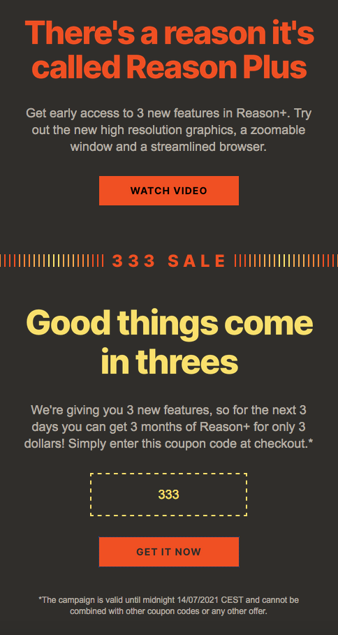 Так это я и сделал и на первый месяц все четко сработало. А вот дальше непонятно, пока в очереди стоит 19.99$. Программу Reason очень давно использовал и решил вот поизучать, что нового в ней с 3 версии. Для этого не хотелось бы пока отгружать по 20 баксов.купон 333 автоматически добавляется