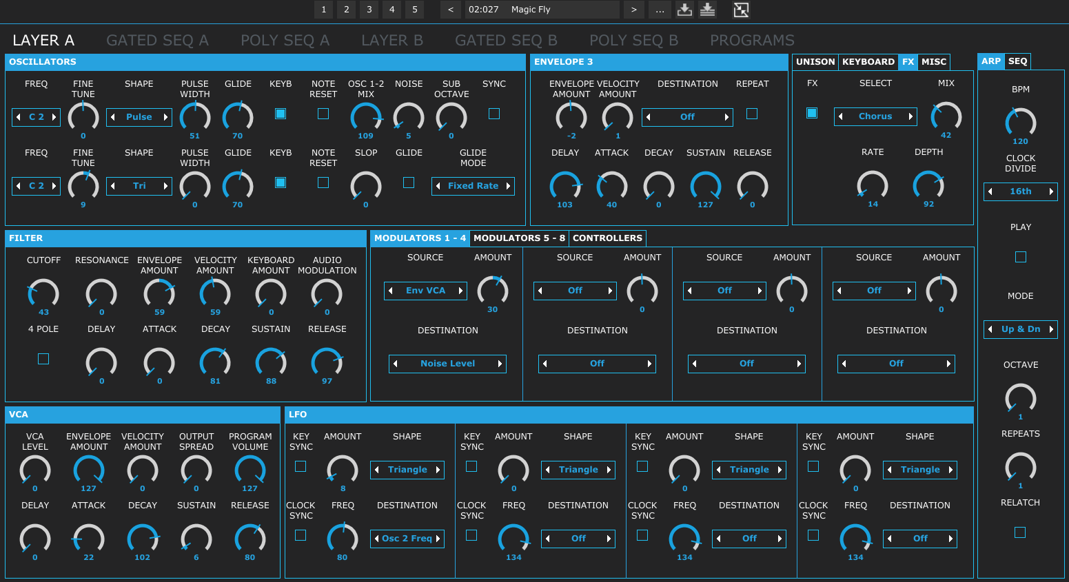 В общем, сколько не видел примеров лида из спейсовского magic fly, ни один не похож. Даже сам Маруани на концертах играет другим звуком. Наверное многие скажут, что там всё элементарно, но пример в студию тогда пожалуйста. Похожего или не очень похожего много, а вот прям точного со всеми нюансами не встречал. Давным давно я его накрутил абсолютно точь в точь, уже точно не помню, но кажется на аналоговой cs-ке, потом засемплировал и благополучно потерял (( В общем было бы интересно услышать, что у кого-то получилось нарулить эту красоту.
