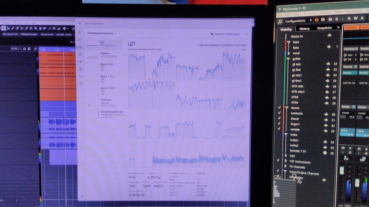 Сравнение. Один и тот же комп на 12700, карта (буфер), Nuendo 13, плагины, проект. Разница в винде. 10 и 11. Замер загрузки cpu в в одном и томже месте проекта. Скачал первый попавшийся виджет и замерил. Справа 11. Слева 10. Сильно не пинайте, может что то не правильно делаю. 1. Проц грузится по разному. 2 Разница в два раза. Кстати asio на 11 процентов на 10 меньше г