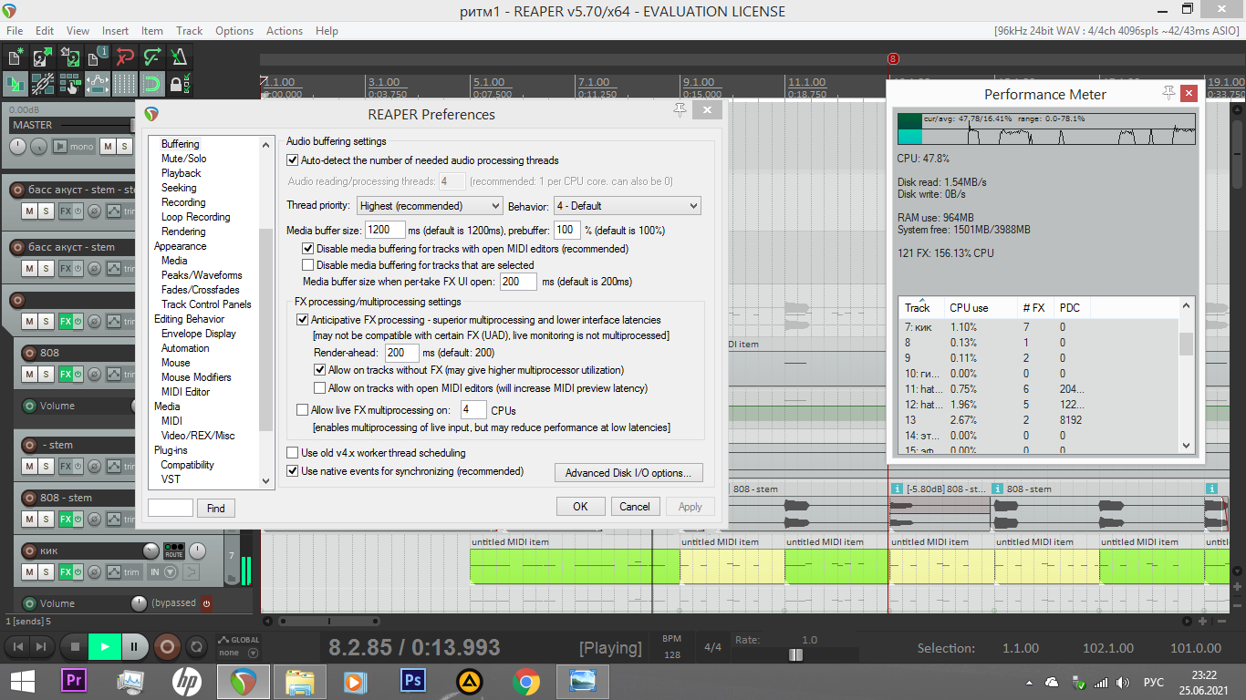 Добрый день подскажите пожалуйста! Пришла на днях карта с томана Rme babyface pro fs не тянет проект начинает трещать, даже при значениях 44100 / 2048, не говоря уже 96000/.... Когда мой berhinger umc 202 нормально все тянет, ноутбук hp pavilion g6. Рабочая станция reaper