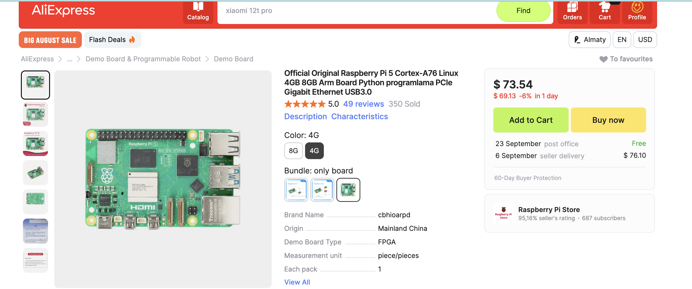 4gb версия стоит 100$ на алике. + нужно докупить аудио шилд(50-100$), либо можете и спользовать любой клас комплаент юсб аудио интерфейс