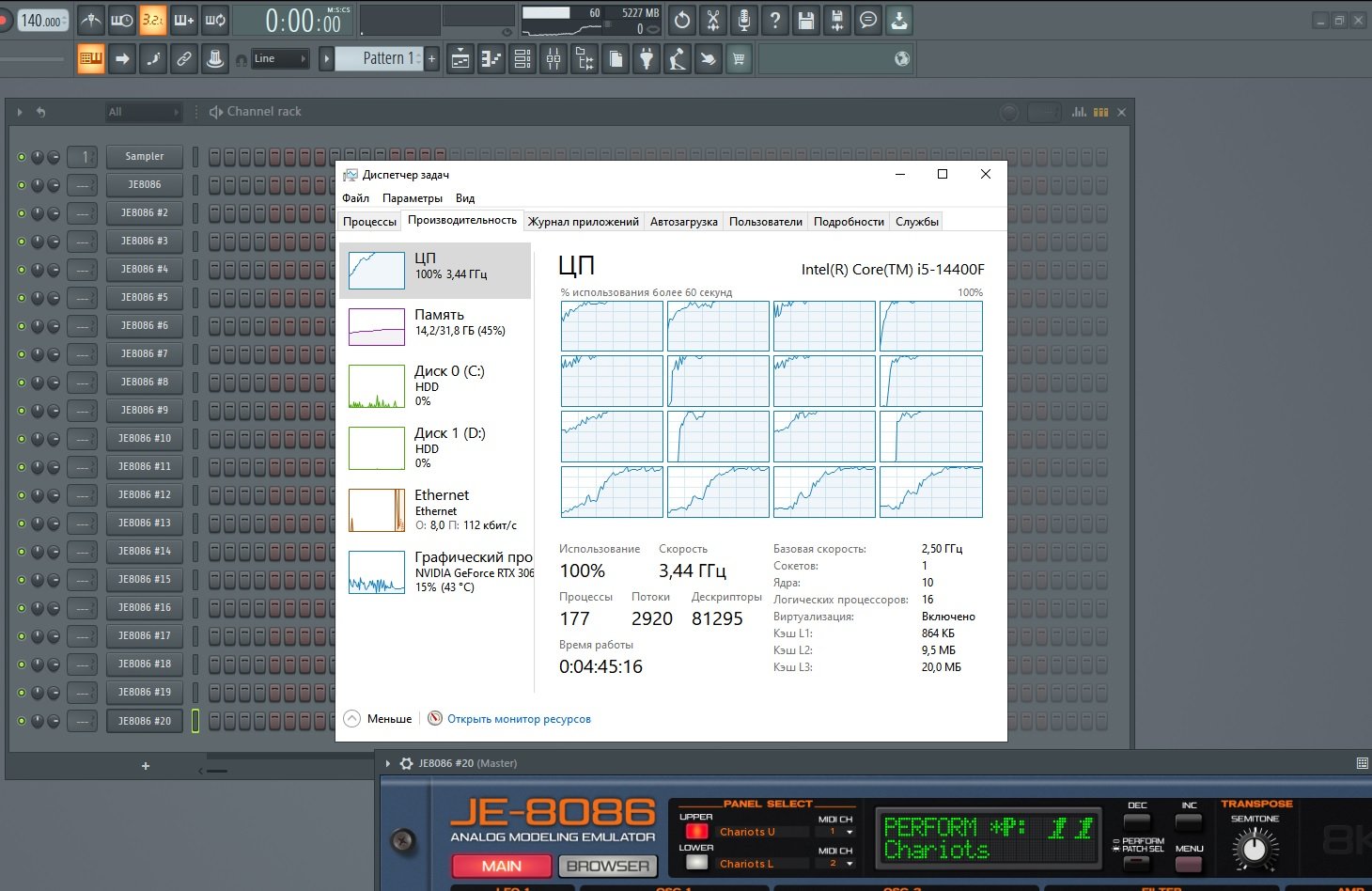 Бюджетный процессор 14400f, открытие эмулей 20шт, каждые +- 1..2-3 секунды, график винды (время обновления обычный) - фл
