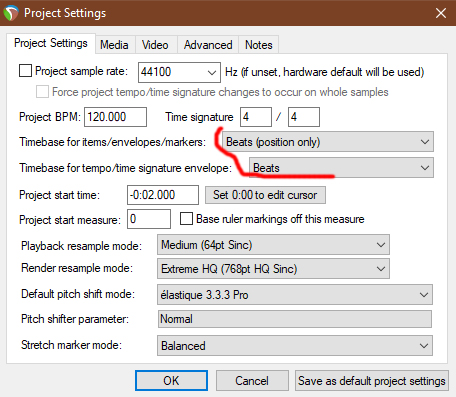 Привет всем. Проблема такая: есть проект, в нем несколько маркеров темпа/размера такта (несколько раз меняется темп и размер). Есть миди и аудио-айтемы. Если я редактирую какой-то из маркеров (меняю темп), то айтемы, которые находятся после СЛЕДУЮЩИХ маркеров, хаотичным образом сдвигаются друг относительно друга и звучат несинхронно. Настройки, которые на скрине, пробовал менять, не помогает. У всех треков и айтемов настройки по-умолчанию, как в проекте.