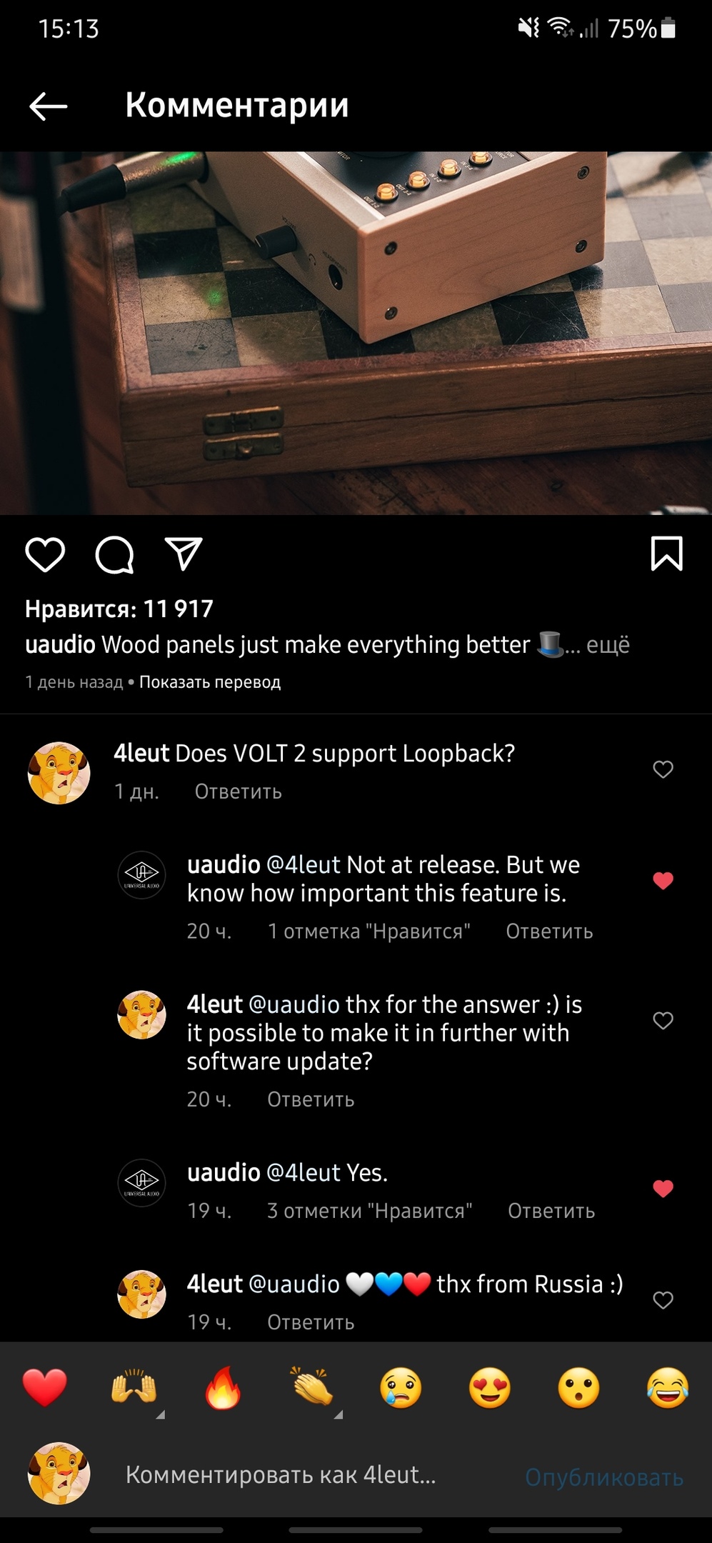 Ребята, для стримеров и кому важен Loopback, я спросил в инстаграме на странице UAudio про Volt 2, на что был дан ответ что на релизе его не будет, но софтверно с обновлениями будет введен, как это понимать непонятно :) может обновление утилиты :) прилагаю скрин