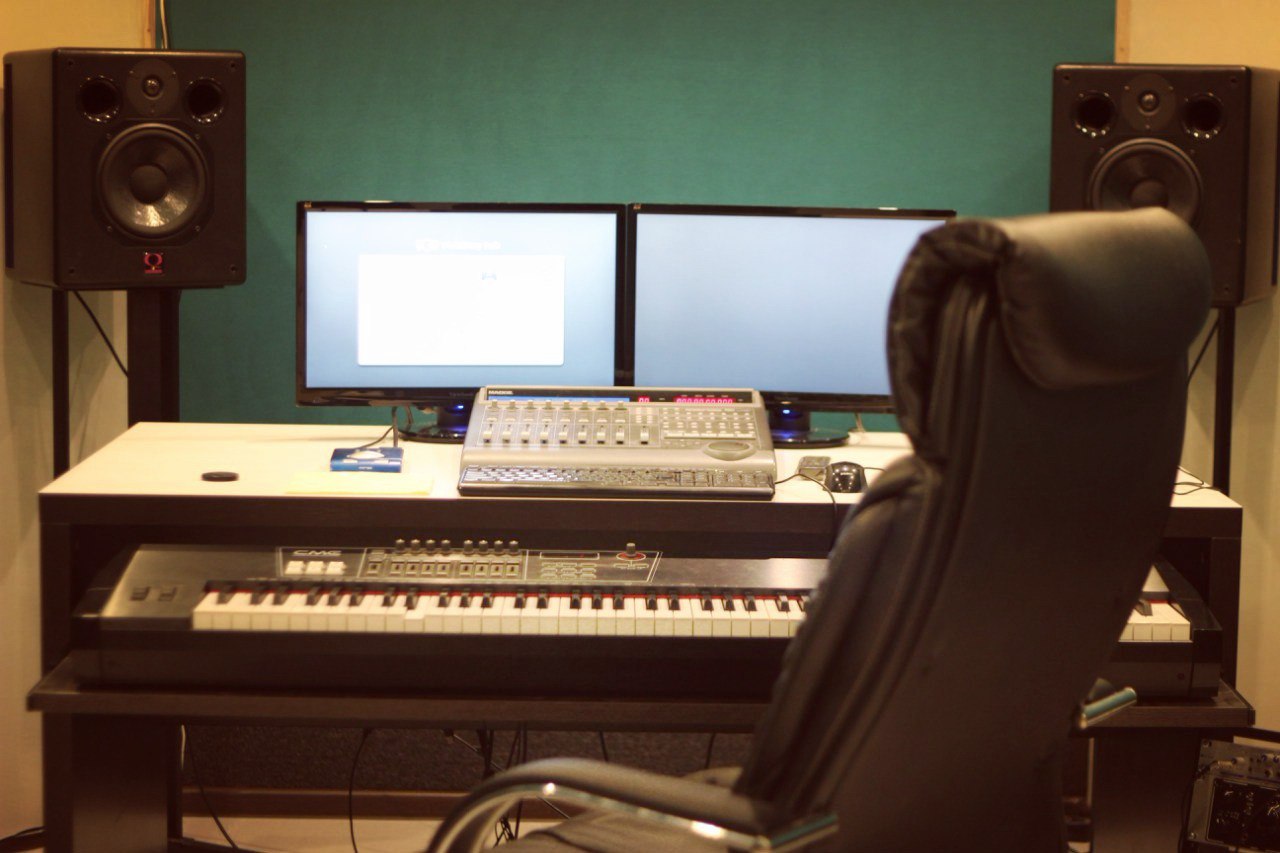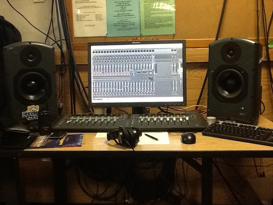 Не между мониторами, но...это у всех звукорежиссеров страсть ко всяким зеврюшкам игрушкам между мониторами