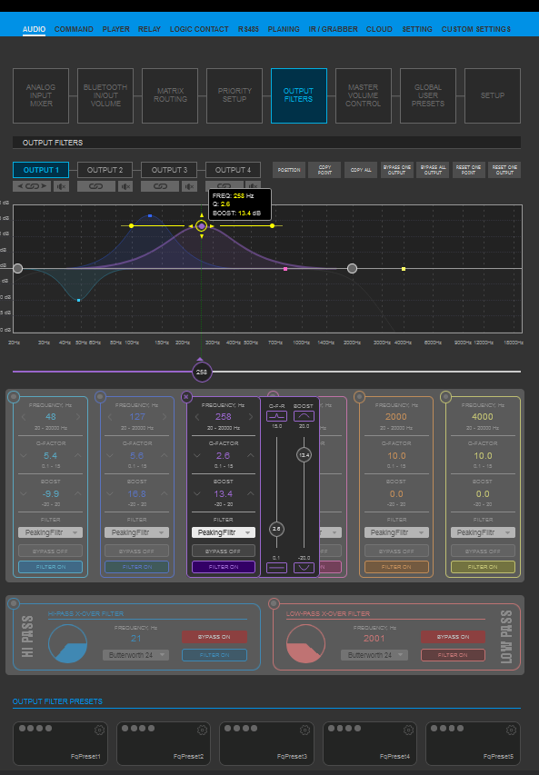 • Встроенный DSP аудио процессор, параметрический эквалайзер на каждом OUTPUT, обрезные фильтры HP/LP, динамическая обработка низких частот при работе с сабвуфером, матричная маршрутизация сигнала 2х4
