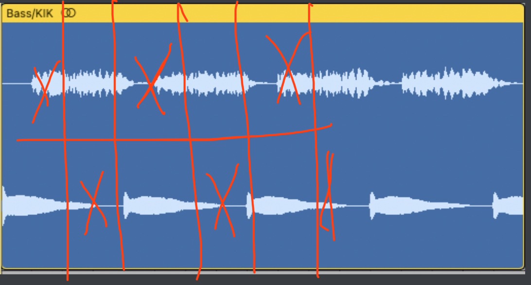 В осцилоскопе видно, что в идеальном случае формы волны Kick и Low Bass красиво занимают ровно левую и правую стороны (восьмые в четверти) соответственно.