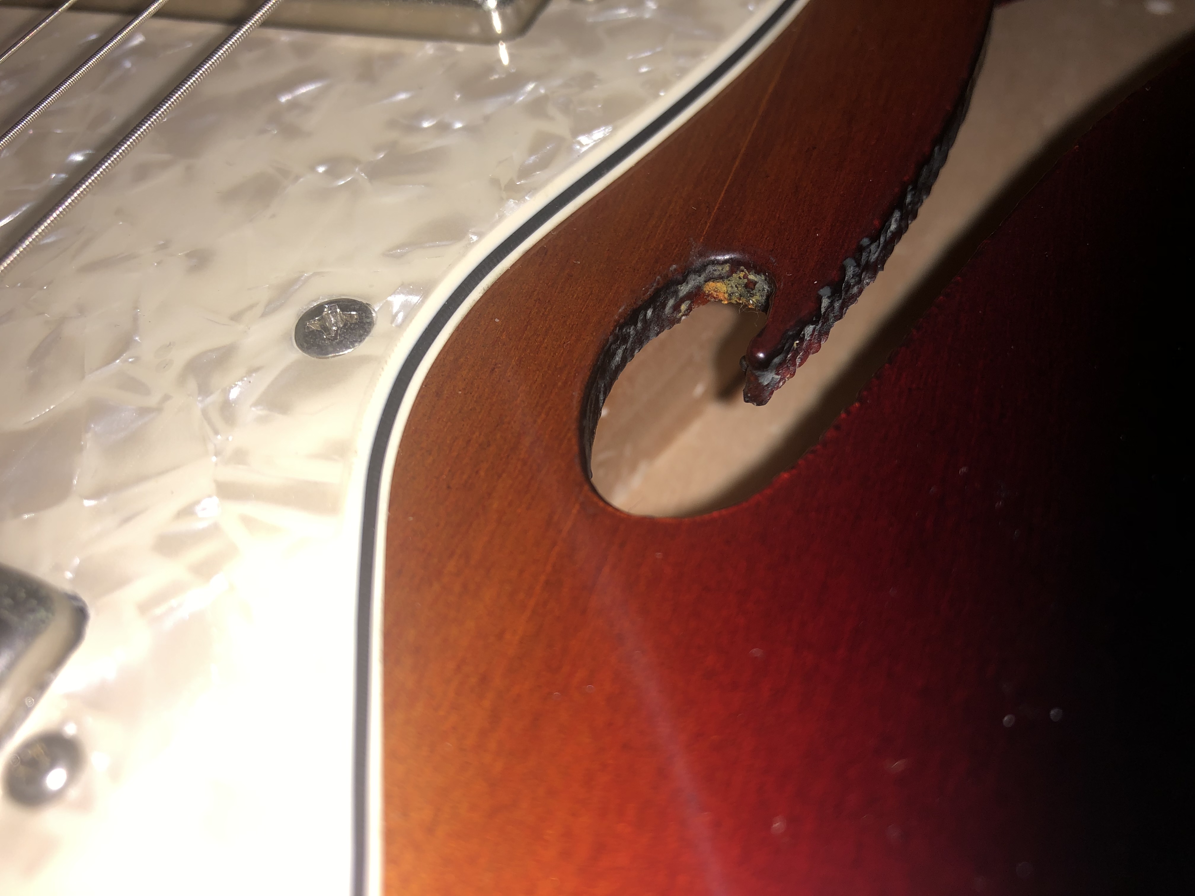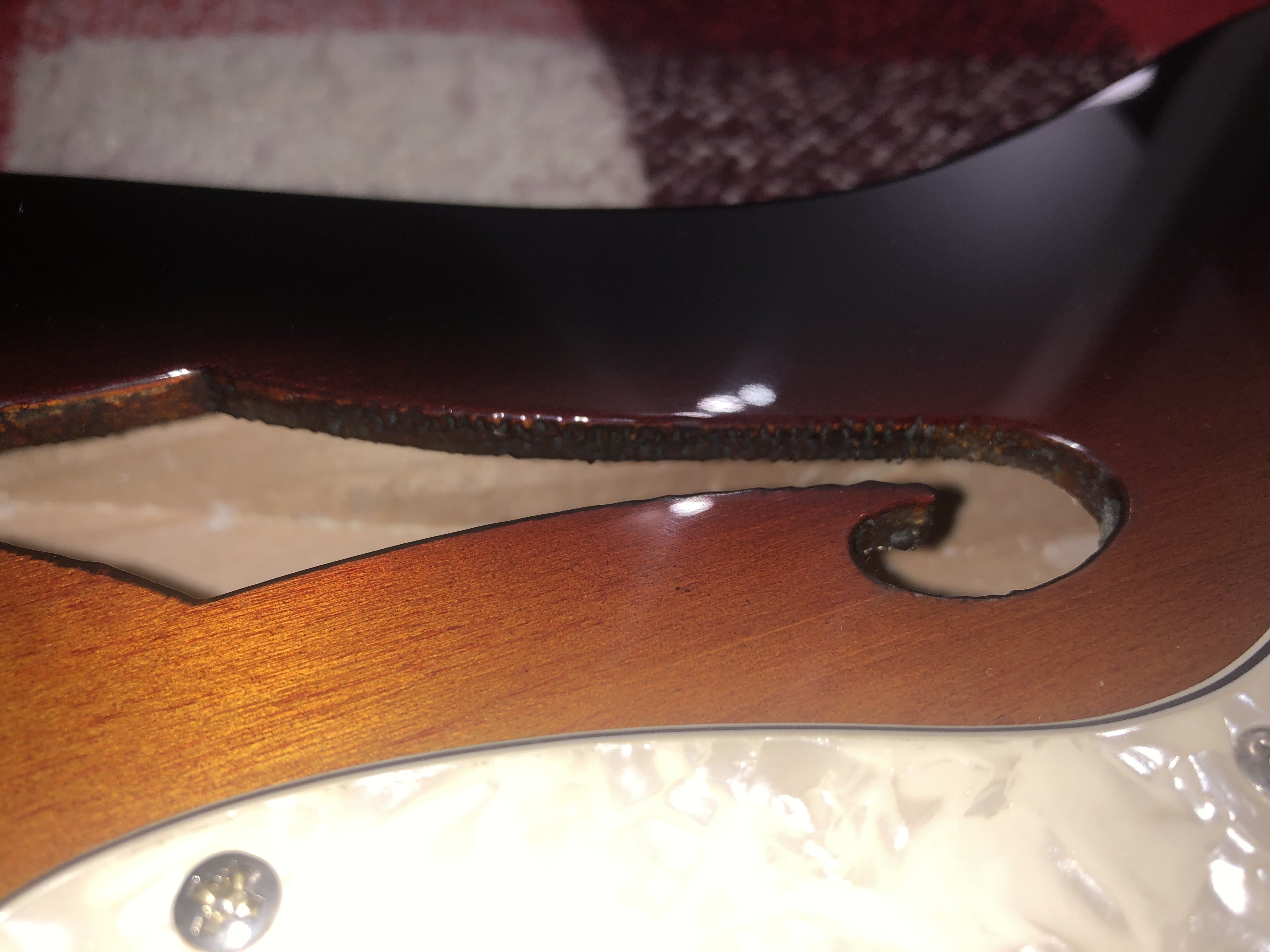 Сегодня пришла гитара через почту, увидел такое (см. фото). При чем у посредника, который её отправлял, такого на фотографиях заметно не было. Что с ней могло случиться в поездке, что лак так сошел? Вообще возможно это исправить, как вы считаете?