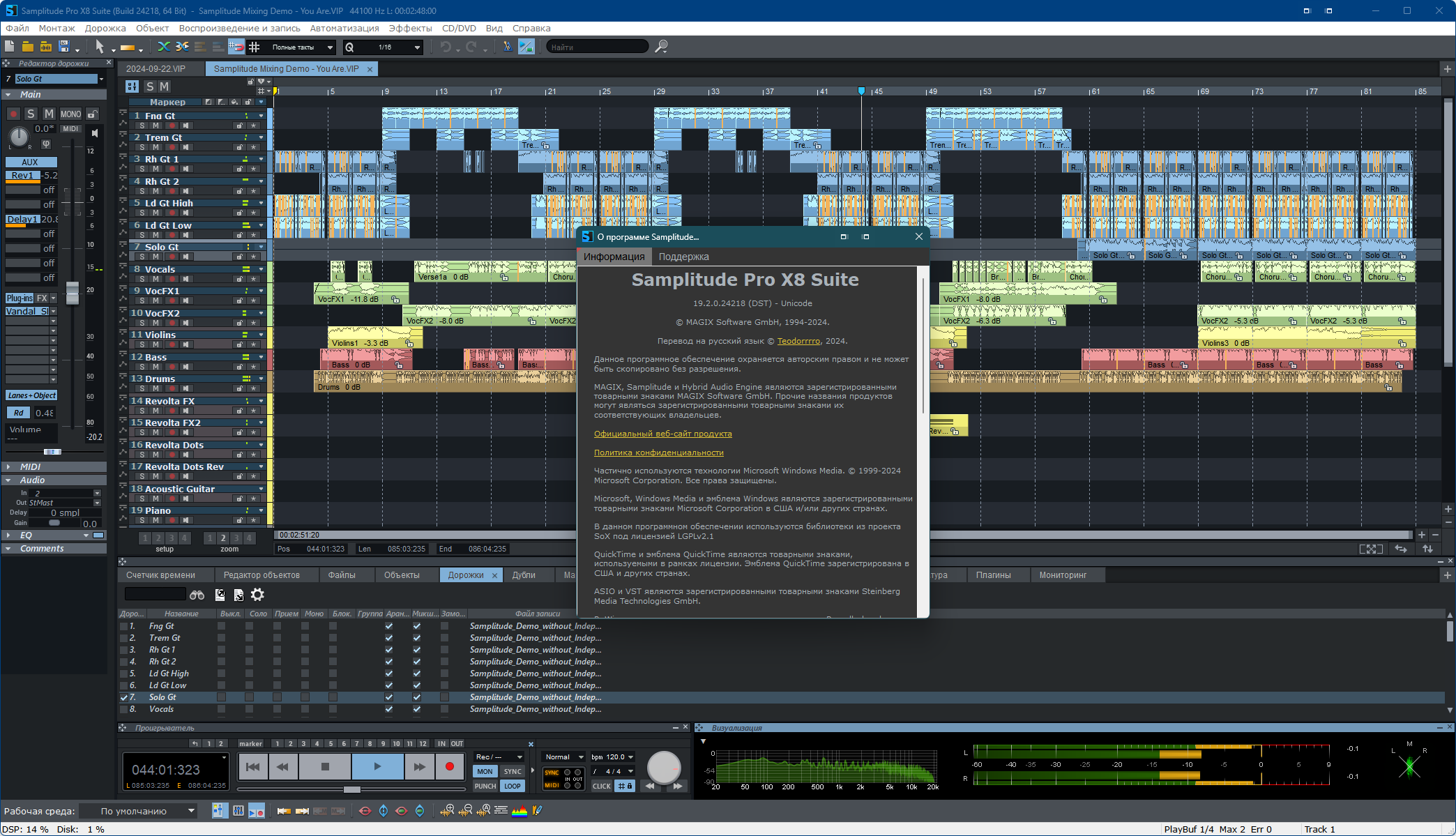 Привет! Публикую русификатор для Samplitude Pro X8 версии 19.2.0.24218, который включает перевод интерфейса и дополнительные материалы.