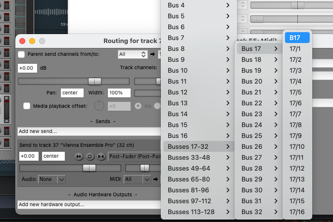 Я предположу только, тк не реализовывал. Имеем 128 миди шин по 16 каналов. Нужно в опциях(reaper preferences) - - >midi devices-->add virtual midi devices(создаём вирт. устройство для используемой миди шины) -->установить значение device ID =номеру используемой миди шины начинается с 0 по127(включительно) . Дальше по обстановке.)