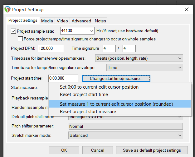 есть такая удобная штука (как на пример в Лоджике), позволяющая поставить 1-й такт в произвольном месте. Это удобно для работы с аранжировкой: первые два такта технические, с 3-го начинается музыка, он назначается 1-м.