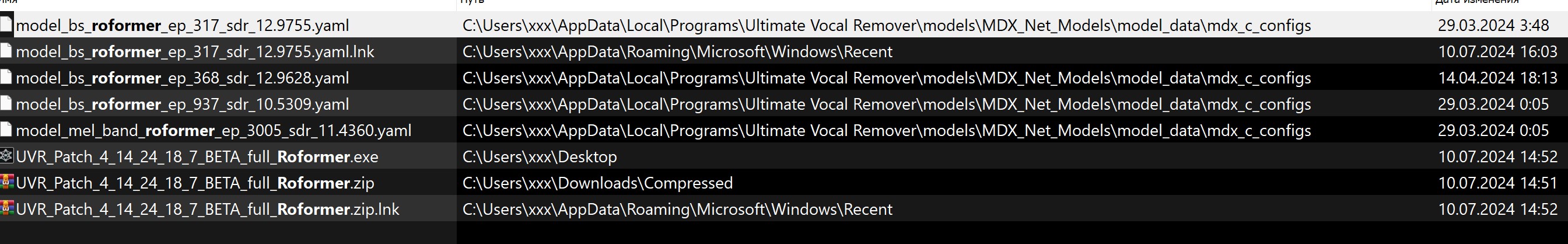 Не надо искать конкретную модель. Нужно понять где лежат файлы моделей, которые видит UVR. Поэтому вместо названия файла указывается звёздочка (wildcard) cимвол "*". Но расширение указывается конкретно. То есть - любой файл с таким-то расширением.@ISEE, У меня получается сейчас две проги, установлены - одна та что на диске С вообще не устанавливалась а просто разархивировалась в папку брал сами знаете где, 30 гб, вторую устанавливал сегодня, установилась в C:\Users\xxx\AppData\Local\Programs Какую модель мне надо найти поиском? По слову Roformer находятся несколько файлов на модели не похожие Посмотреть вложение 249686