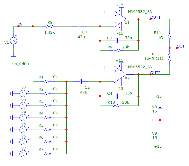 2) При сравнении схем с транзистором/без него Вы допустили две ошибки. Во-первых, надо симулировать схемы не на идеальных компонентах, а на реальных. А так - это просто симуляция пресловутого коня в вакууме, т.к. учитываются только шумы резисторов. В том-то и фокус таких схем, что добавив к дешёвому ОУ, вроде TL072 с его шумом 18 нВ/^Гц дешёвый же транзистор, вроде 2N4403, получим привед. ко входу шум 1...1.5 нВ/^Гц, как у дорогих ОУ, а линейность иногда даже лучше. И это хорошо будет видно в симуляторе.