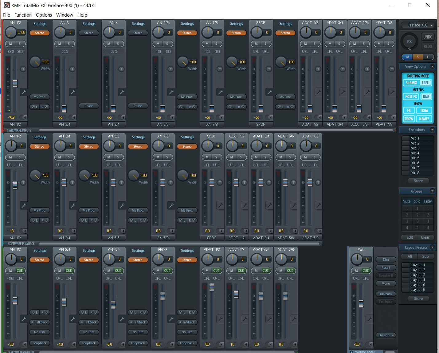 1. Fireface 400/800 - legacy интерфейсы с аппаратным ядром, оптимизированным для IEEE1394, их архитектура существенно отличается от новых с ядром USB, здесь не все аппаратные параметры входов управляются непосредственно в TotalMix, часть из них - в контрольной панели драйвера. Fireface 400 и Fireface UCX аппаратно абсолютно разные интерфейсы
