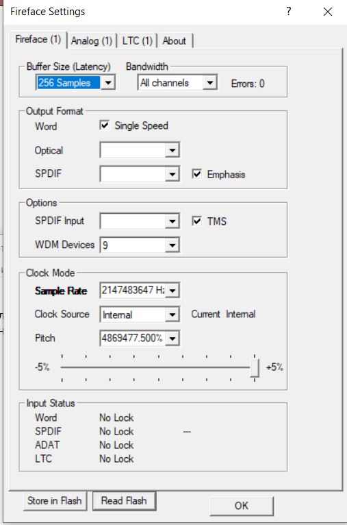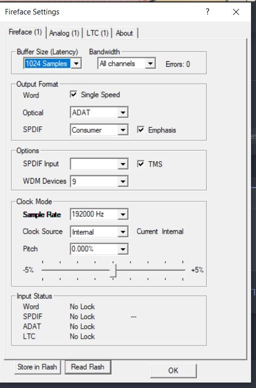 Я сумел подать питание на микрофон, нажав в Fireface setting - кнопку read flash. После этого 2 лампочки 48V засветились, микрофон работает, но когда отключаешь карту, то можно включить снова 48V только через эту кнопку read flash. В самом TM нигде нет кнопки 48V. И отключить 48V можно только выключив карту. Вот такая непонятная ситуация. Попробовал пять версий TM, включая самую древнюю для Windows 7 - результат один - нет кнопки 48V нигде. Пробовал несколько раз прошивать в последнее время Flash программой с официального сайта... Хорошо хоть заработало, значит, не сломана, но непонятно почему так работает.
