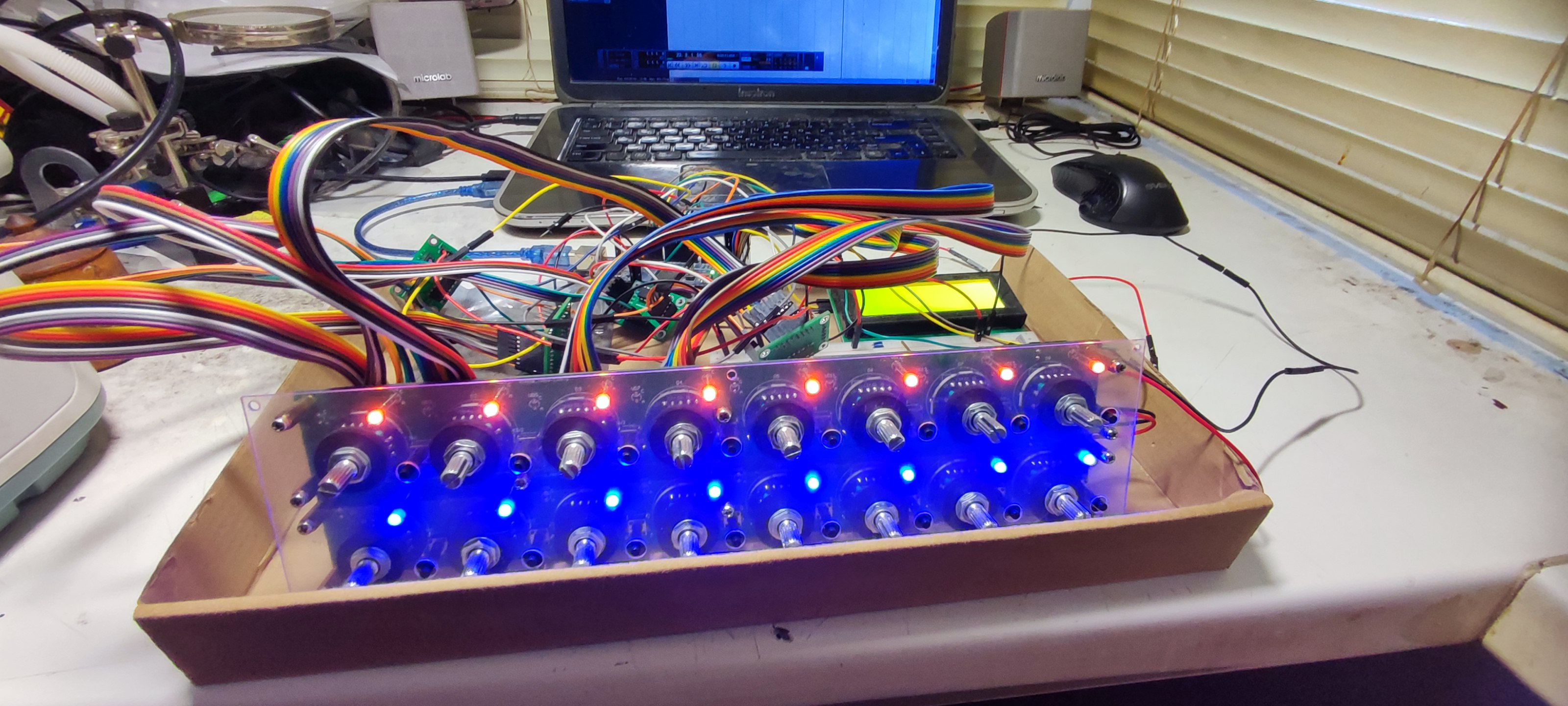 На фото - концепт: 16 энкодеров с кнопками со светодиодной индикацией на срабатывания кнопки (миди сообщения) + 16 круглых кнопок для отображения параметров на которые замаплен активный энкодер с кнопкой. Платформа Ардуино Мега. По схемотехнике возможно размещение 16 энкодеров + до 100 кнопок + различные гнезда для подключения, скажем педалей экспрессии ( в текущем моем проекте их 5 штук). Есть вариант, что пинов должно хватить и на 24 энкодера.
