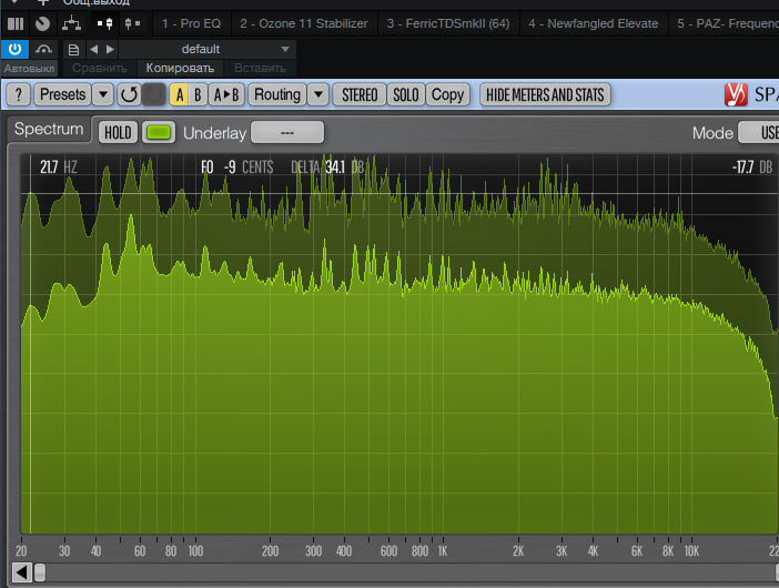 У меня кстати для усреднённой оценки вэйвс спектр хорошо работает. Его достоинства в том, что он не резайзится и не трансформируется никак, по этому за долгое время работы привыкаешь к его характеристикам отображения, и уже слёту понимаешь что может быть не так. Но ноты бас спектров, и уж тем более саб контр октавы в таких режимых отследить нереально. Там нужен буфер сайз в 16-32тыщи сэмплов, желательно.