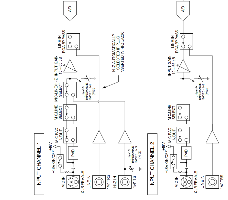 При этом, во всех Apollo Rack сигнал, поступающий во входы XLR должен быть всегда микрофонного уровня и всегда идет через усилительный каскад на PGA2500, а все, что включается в TRS - только линейного и этот сигнал идет в АЦП отдельно, через свой согласующий буферный каскад с unity gain. В Apollo Twin X/x4 gen2 входные каскады теперь сделаны практически так же, как в Apollo x Rack, ниже - фрагмент блок схемы Apollo Twin X Gen2