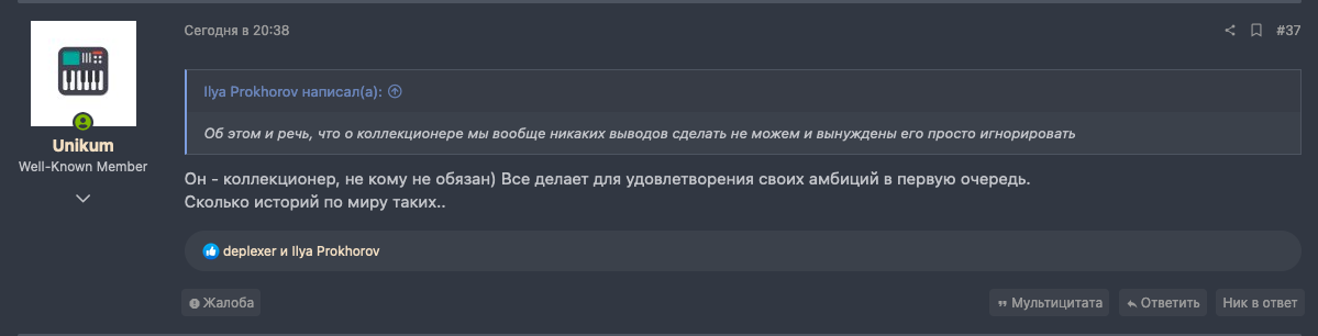 По теме. Во первых никогда не понимал претензий по типу а чего у этого человека столько синтезаторов а он ничего не пишет и не выкладывает (и дальше так презрительно, коллекционер наверное). Во первых никто никому ничего не должен, это раз. Человек может себе позволить. Купил, поставил и любуется а может для себя крутит и играет и записывает, это его личное дело.