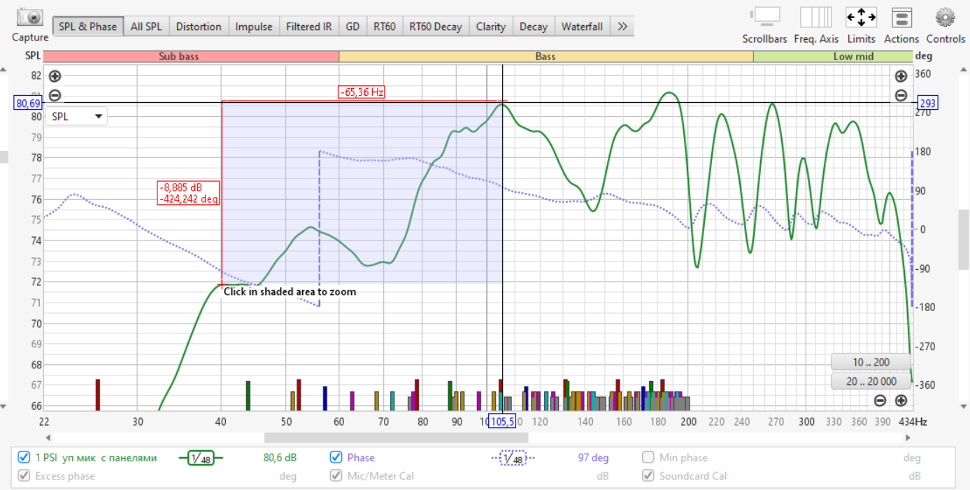 И вас не смущает отсутствие НЧ, посмотрите на спад до 40 Гц и как закрутило фазу. И эти НЧ ,как говорится, надо взять бесплатно, не покупая сабвуфер. Вот эту проблему нужно найти и убрать. А для этого, топикстартер сделает правильные измерения, тогда и посмотрим.;)