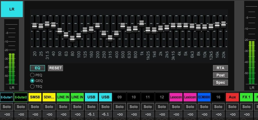 Канальные и графические эквалайзеры могут быть запрограммированы на наличие спектральных RTA и могут работать как в режиме pre так и post-EQ. Этот выбор можно переопределить на вкладке channel/bus EQ (EQ канала/шины). Выберите параметр «Использовать источник RTA», если вы хотите просмотреть RTA источника при настройке эквалайзера другого канала. Это полезно для подключения измерительного микрофона к одному из входных каналов и выбора его в качестве источника RTA. Дисплей RTA (например, на Main LR или Monitor EQ) теперь всегда будет использовать фактический микрофонный сигнал от помещения, чтобы вы могли легко настроить систему.