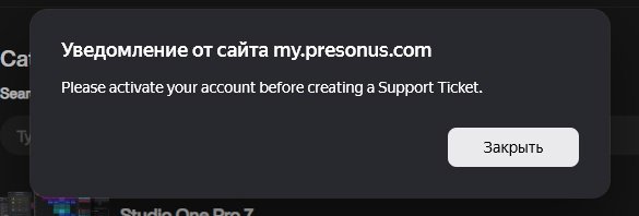 Друзья, подскажите пожалуйста, как связаться с поддержкой Пресонус? Я на сайте пытаюсь написать тикет, а мне пишет, что нужно активировать аккаунт, хотя аккаунт у меня активирован и Студио Ван куплена.