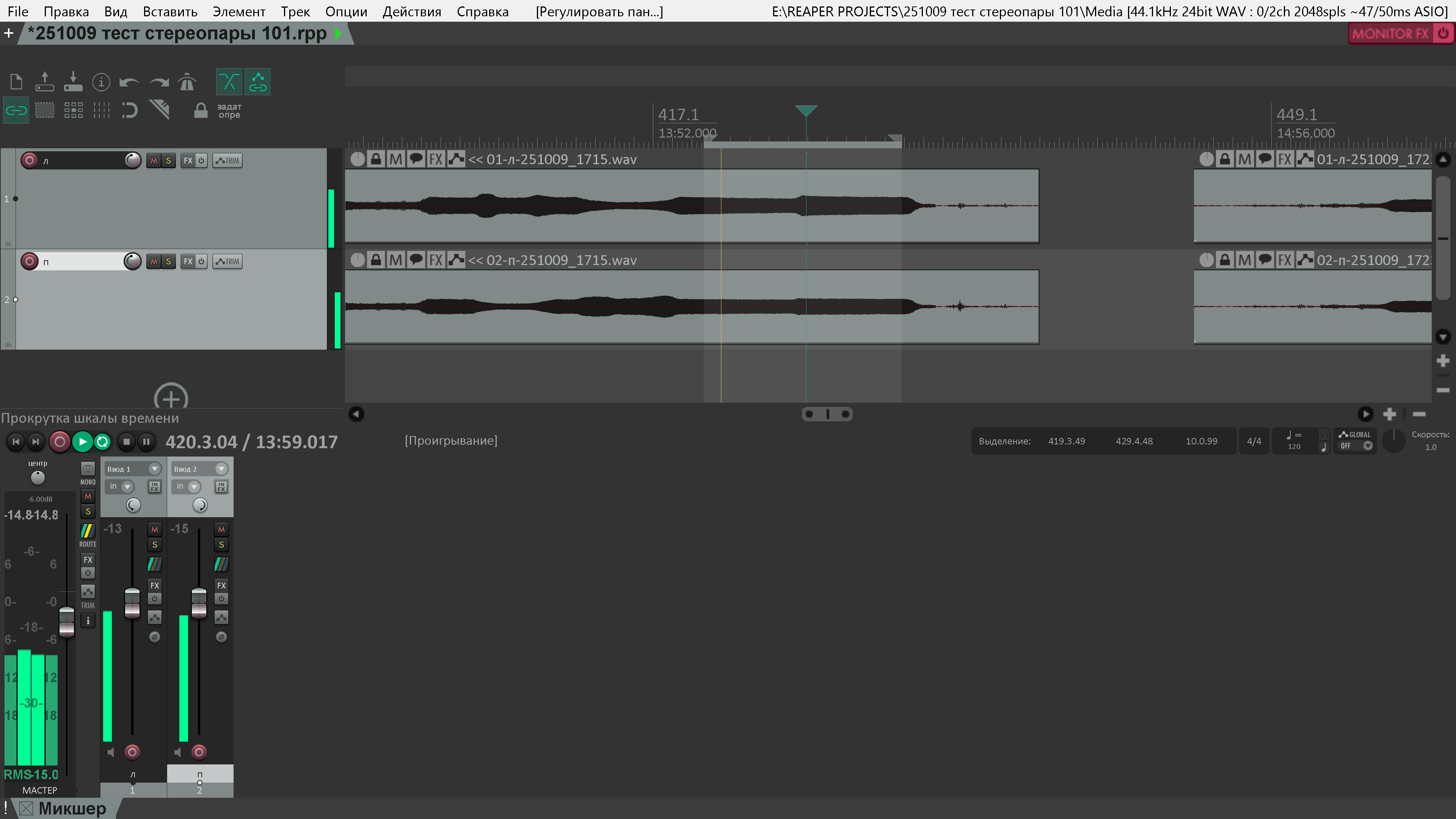 Разумеется, условия записи были равными для обоих экземпляров стереопары: равная длина кабелей, равное расстояние от источника сигнала до мембран, равное усиление на предусилителях каналов звуковой карты.