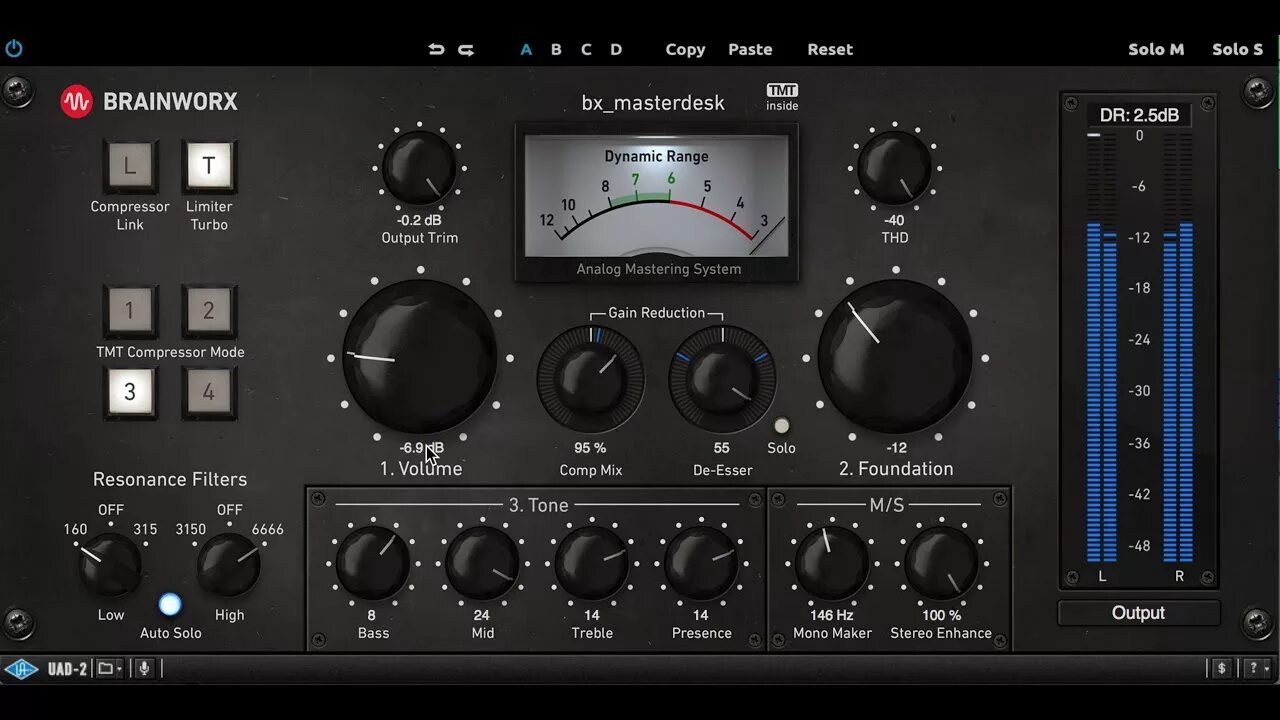 3. Групповой компрессор, чисто склеить микс с ratio 2 на пару децибелов. Основная работа по компрессированию - на треках и шине.