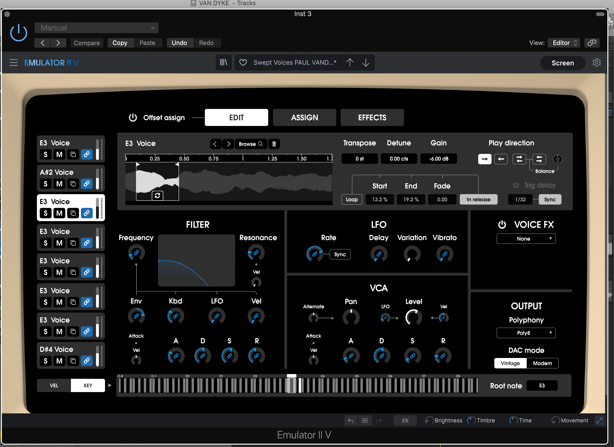 Накрутил похожий звук (vox) из трека Paul Van Dyk – For An Angel. Emulator II V от ARTURIA preset-Swept voices (E3 voice)