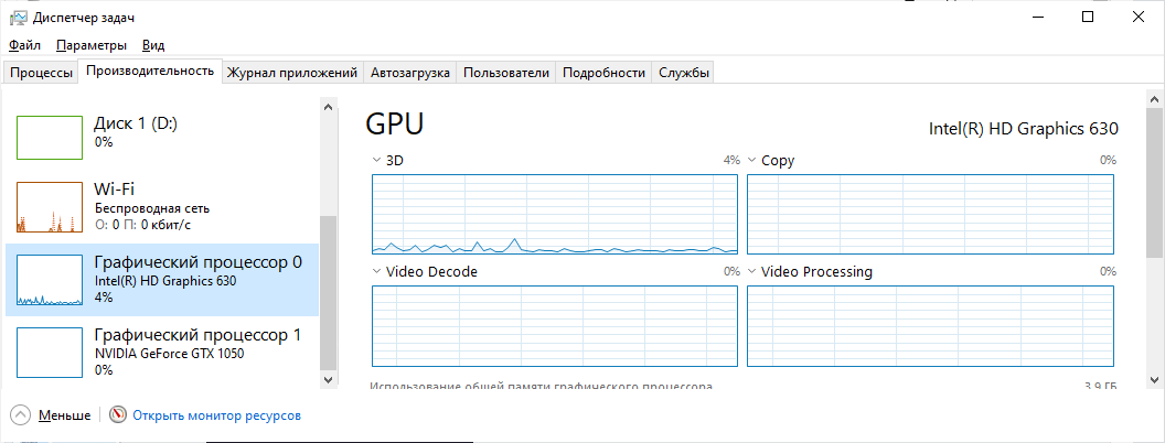 Проверить использование видеокарты можно в Диспетчере задач