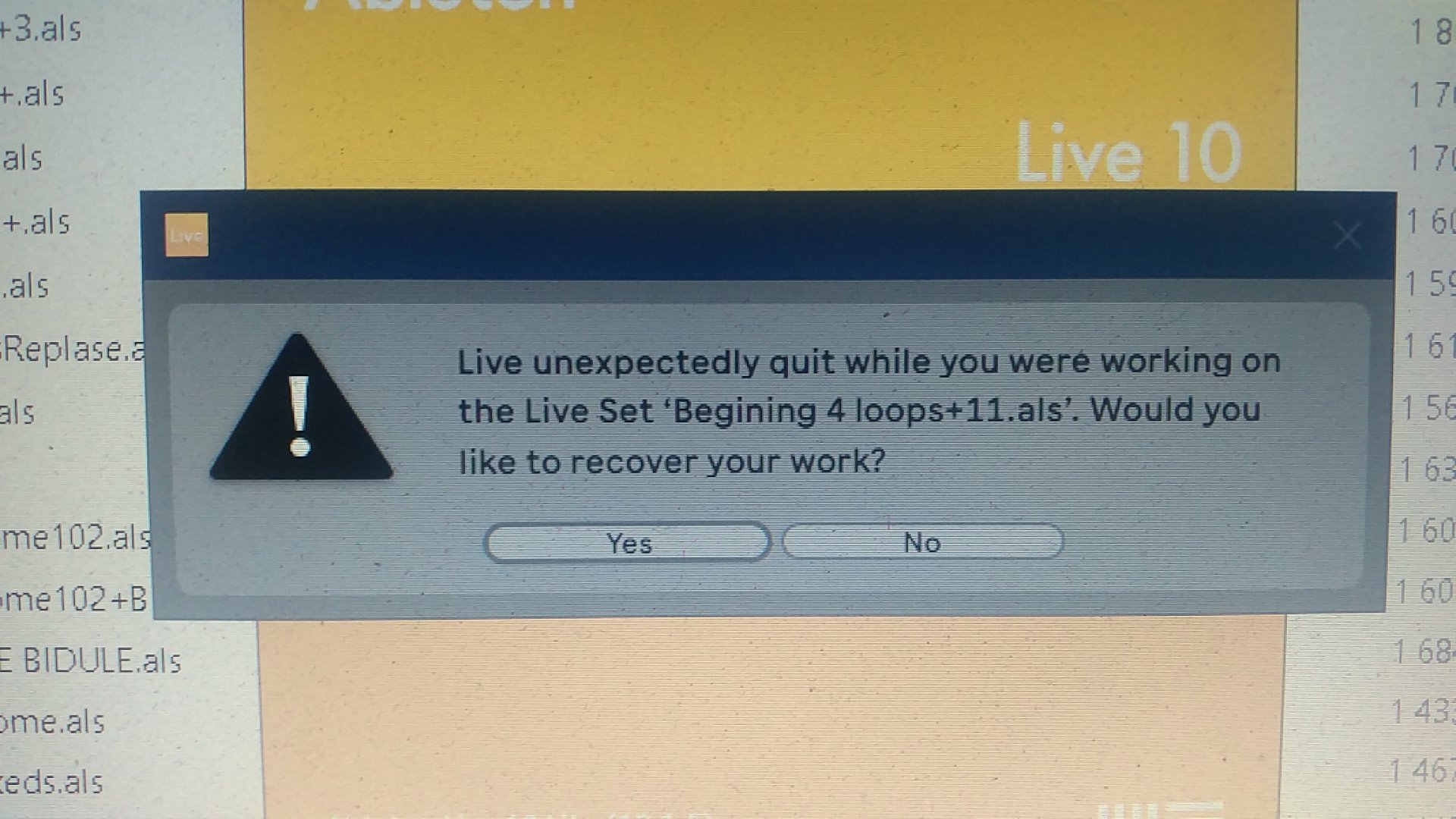 Господа, посоветуйте: как избавиться от появления такой надписи во время загрузки Live? И с recover, и без оного - после сохранения текущего проекта и открытия другого пишет, что предыдущий проект "неожиданно закрылся" (хотя, он был закрыт штатно)... Что бы, это могло означать?