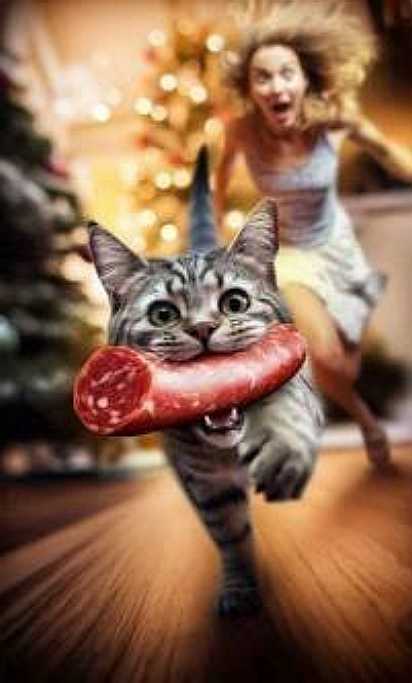 Одноногий заботливый кот, тянет лапу, чтобы открыть холодильник и вернут колбасу со стола на ее законное место.