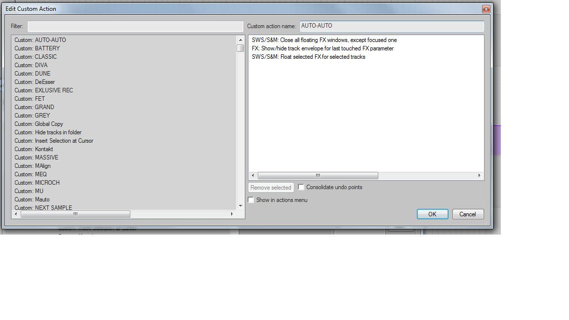 Я хотел , чтоб покрутил параметр , жмакнул клавишу и появилась линия автоматизации этого параметра . Стандартный FX:Show/hide track envelope for last touched FX parametr работает после закрытия окна плагина .Сделал себе экшен ,чтоб закрылось окно плагина , появилась огибающая автоматизации и открылось окно плагина . Но он зараза работает только при нажатии RUN , а с "горячей" клавиши - нифига .Подскажите чего убрать - добавить в экшен .