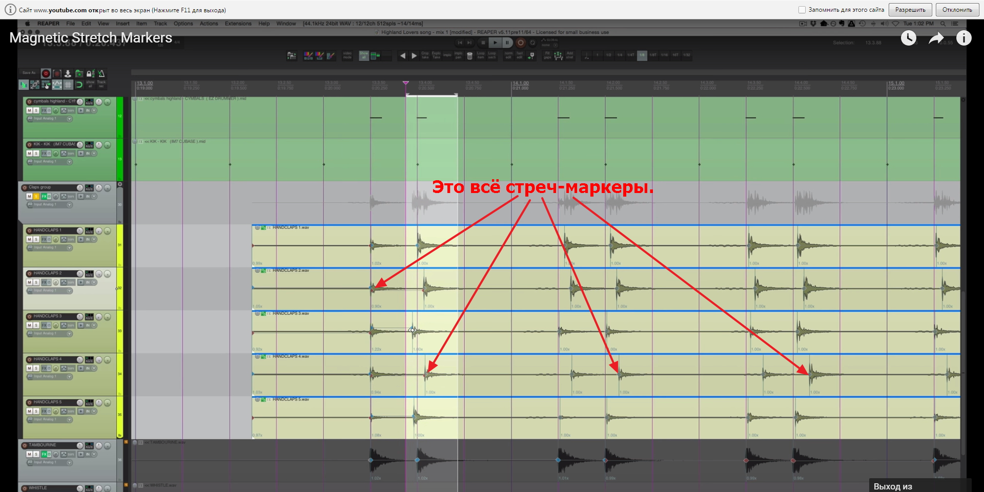 всплывает подсказка "Ajust stretch marker да . вижу ее в углу .... так скажем я не знал что должны быть стретч маркеры на этих треках , наверное поэтому и не всматривался в них ... думал на видео приводится другой принцип работы зависимый от выделенной области