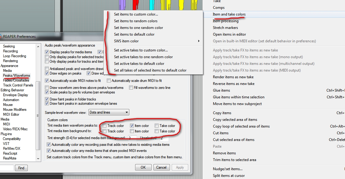 А вот если поставить две галочки в настройках Peaks/Waveform -->> item color(waveform)+item color(background)., то уже будет и в первую очередь красится именно фон итема, а волна уже идет не в приоритете и туда подмешивается оттенок выбранного цвета.А можно ли точно задавать цвет для волны при включенным двух галочках?