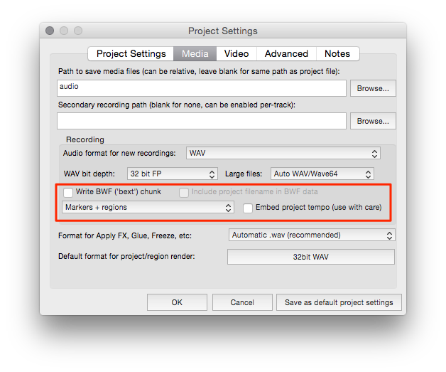 Включить в настройках проекта, во вкладке media, запись в файл BWF. Поставить несколько маркеров в проекте и на этом месте сделать запись.