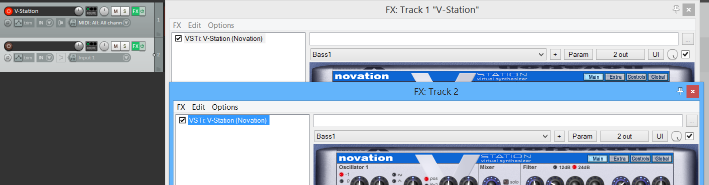 вот два трека, первый создан как insert virtual instrument on new track, а второй как insert new track , и их FX окна, но в первом треке синт играет (также присутствует в имени трека), а во втором - не играет и не присутствует - в чем разница и какие настройки внутри трека (миди-адио роутинг итд итп) нужно произвести, чтобы синт появился/играл