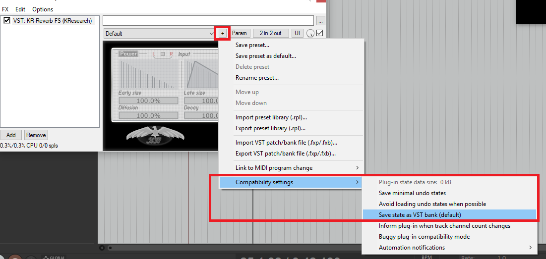 У меня KR-ReverbFS и KR-DelayFS слетают на дефолтные настройки после перезагрузки проекта. И ещё пару плагов таких встречалось. Хорошие плаги, но использовать невозможно. Приходится отказываться от таких.
