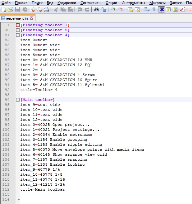 Может Вы имели в виду файл reaper-menu в корне? Его действительно можно открыть Notepad, но менять экшены с иконками между тулбарами там адский ад, т.к. это нужно делать отдельно для иконок, отдельно для экшенов, а еще следить чтобы нумерация иконок совпадала с нумерацией экшенов, ибо всё поплывет