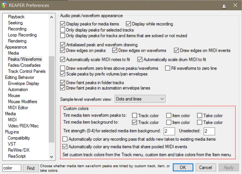 Дело в том, что я не менял этих настроек (не представляю как оно поменялось), поэтому и не искал в настройках, а смотрел в экшенах, искал по слову "Color", я предположил что запущен какой-то экшн в проекте. Для меня рипер, пока ещё является загадочной кучей настроек, пользуюсь им совсем недавно и ещё не очень хорошо ориентируюсь.