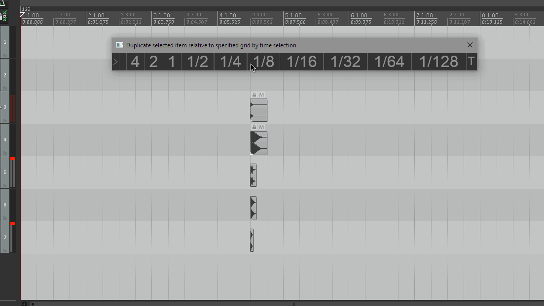 @Archchie, А возможно ли сделать -Smart duplicate items grid relative по тайм селекшн?Кстати в этом примере копирование практичней,но приходиться растягивать куски аудио,до нужных величин.В лучшем варианте: если бы появлялось меню,как в Nudge set(1/2, 1/4, 1/8 и т.д)выбрал нужное,выделил time selections применил экшн.