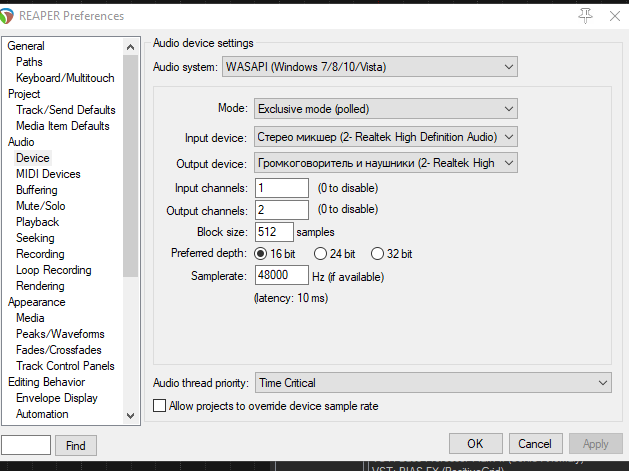 @Men_Pamansky, категорически не советую использовать ASIO4ALL. Если нет карты с ASIO, то лучше использовать WASAPI Exclusive. Лучше после смены устройства перезагрузить рипер. То же касается и перевода - тут практически все пользуются оригинальной версией (английской), а перевод только усложняет всем жизнь (неточности перевода, проблемы с пониманием как с вашей стороны, так и со стороны помощников).