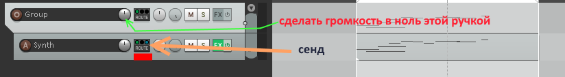 Как убавить громкость в ноль с Group трека, если в подгруппе (Synth) задействован сенд?