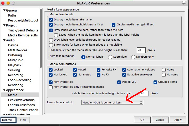 @Alexander Yakuba, У меня вообще настроено так: Cmd+колесо мыши - +/- 1dB, Cmd+Shift+колесо - +/- 0,1dB. Cmd+Ctrl+колесо - сброс в ноль. Уже и не помню когда вручную линию эту тягал))) машинально уже с колесом все делаю. И у меня настроено чтоб он выделял айтем под курсором, не снимая выделение с уже выделенных, тоже иногда удобно, ну и чтоб на всех айтемах сразу менять конечно.