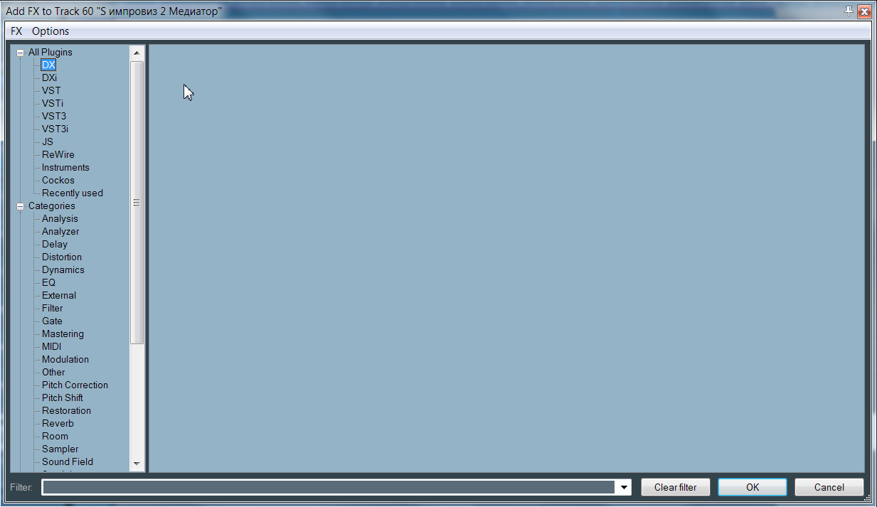Доброе время дня (или ночи). Полное непонимание происходящего - в чём беда? Исчезли из списка все плагины DX и DXi. Месяц назад были, теперь открываю - нет ни одного! Причём в старом проекте, где я уже применял DX, эти плагины стоят и работают, но в списке их нет...