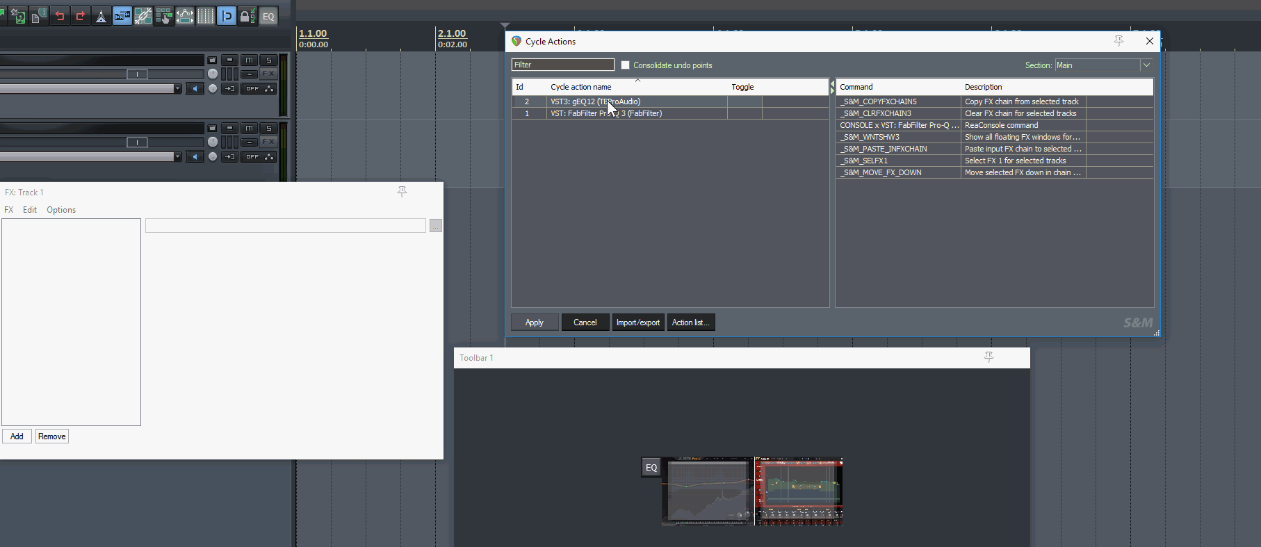 Но еще одна проблема. Как создал хотябы 2 EQ, в моем тулбаре, а когда выбираю что то из этого, не добавляется на трек ни то ни другое :rolleyes: Пример на гифке. Действия для экшенов делал по видео внимательно. Из видео алексея погорелова про экшены. Но что тоне фурычит, не добавляется на дорожки. делал вроде все внимательно.