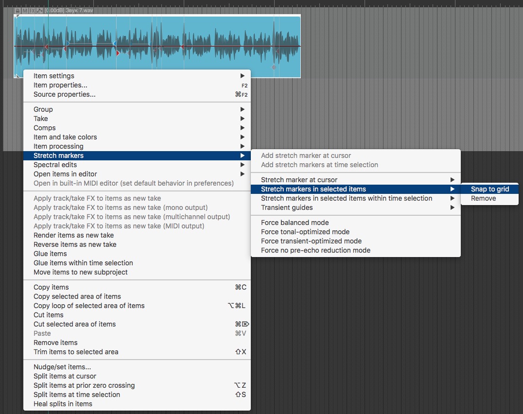 @Ivan_k26, Item: Dynamic split items - детектируешь stretch markers. Потом правой кнопкой по айтему и как на скрине. Или можно использовать скрипт например spk77_Quantize stretch markers.eel. Я глубоко не копал, но суть такая мне кажется.